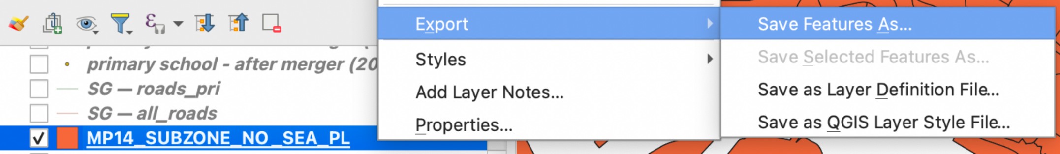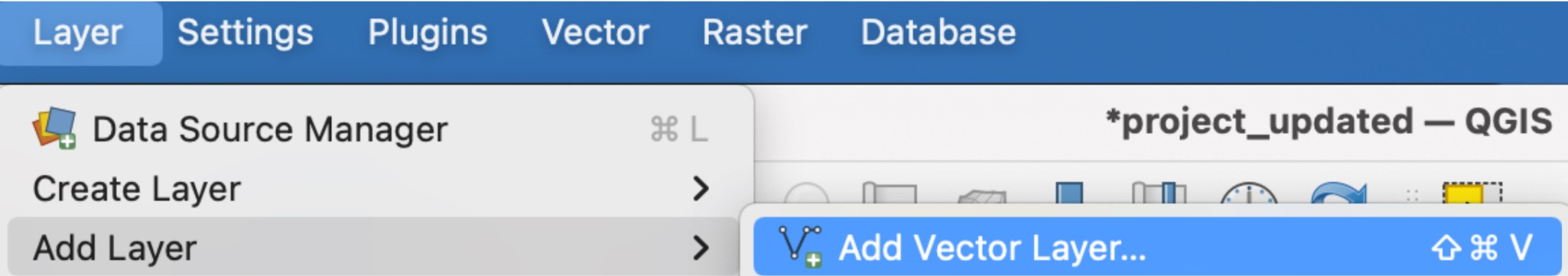 Download Master Plan 2014 Subzone Boundary from data.gov.sg and import it into QGIS. To do this, select Layer > Add layer > Add vector layer.