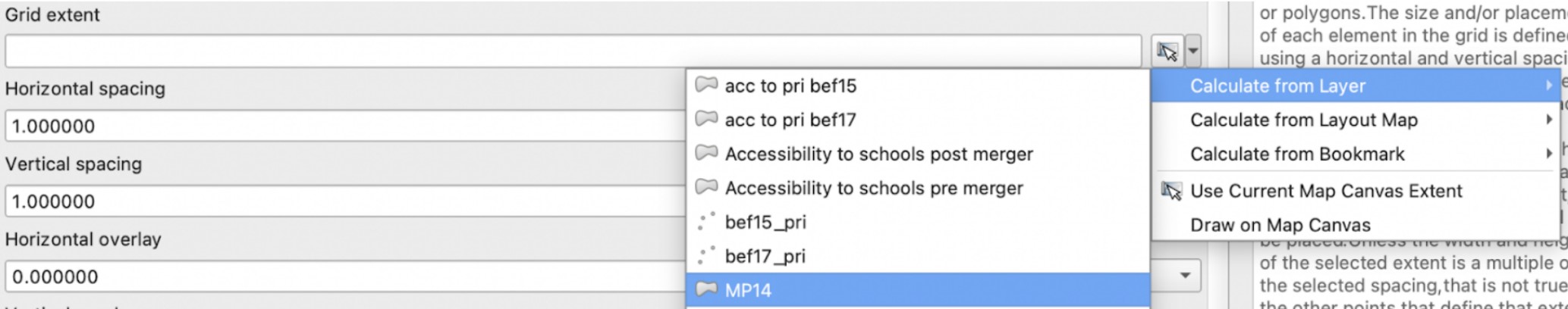 Select Vector > Research Tools > Create Grid. The Create Grid dialog window appears. For Grid type, select Hexagon (Polygon). For Grid extent, click on the dropdown and select Calculate from Layer. Select MP14.