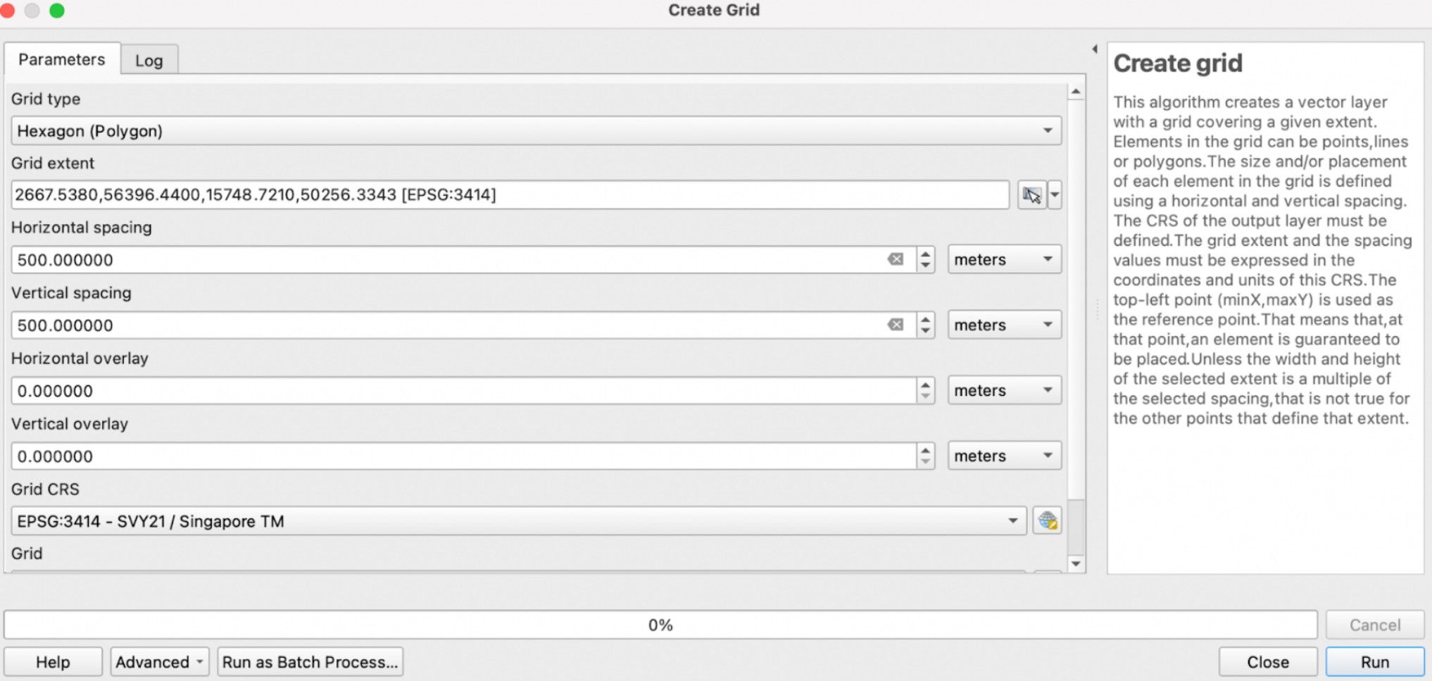 For both Horizontal spacing and Vertical spacing, enter 500. For Grid CRS, select EPSG:3414 - SVY21. Your dialog window should look like the screenshot below. When ready, click Run. Click Close. A temporary layer called Grid is added on to the Layer pane.