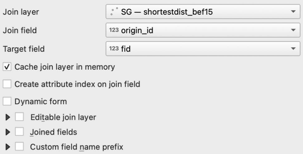 Right click on the acc to pri bef15 layer. Select Properties > Joins > Add. For Join layer, select shortestdist_bef15. For Join field, select origin_id. For Target field, select fid. Your dialog window should look like the screenshot below. When ready, click OK.