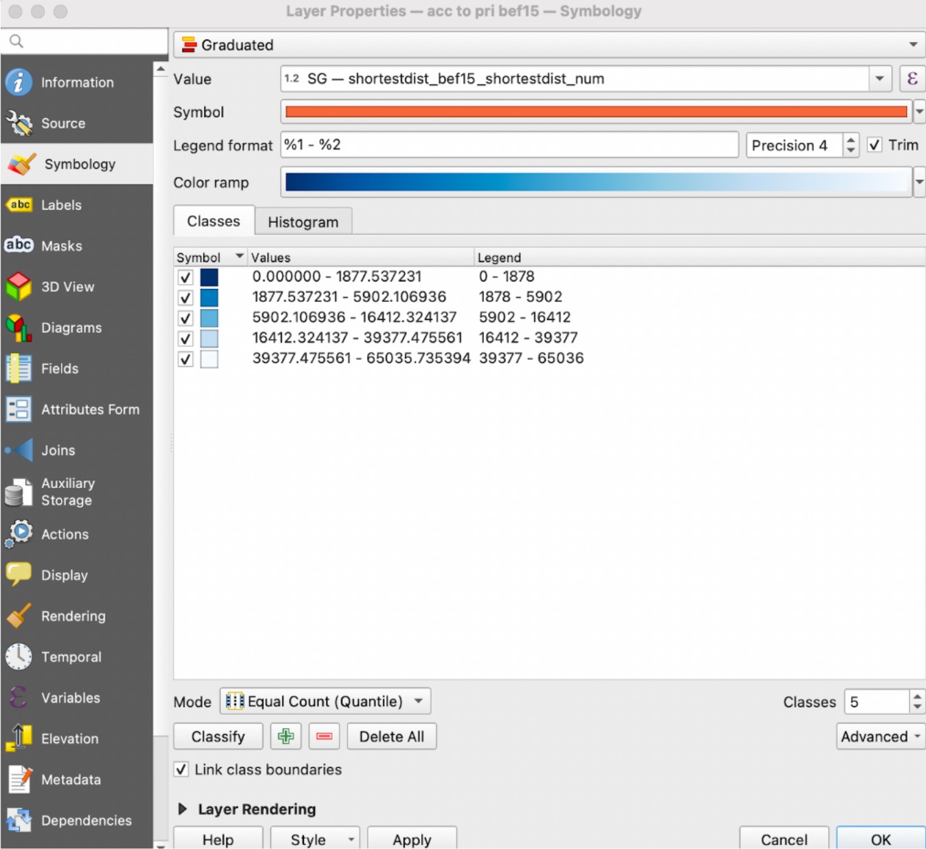 Right click on the acc to pri bef15 layer. Select Properties > Symbology. Select Graduated. For Value, select shortestdist_bef15_shortestdist_num. Change the colour ramp to your preferred colour. For our map, we used blue and inverted the colour ramp. For Mode, select Equal Count (Quantile). Click Classify. Your dialog window should look like the screenshot below.
