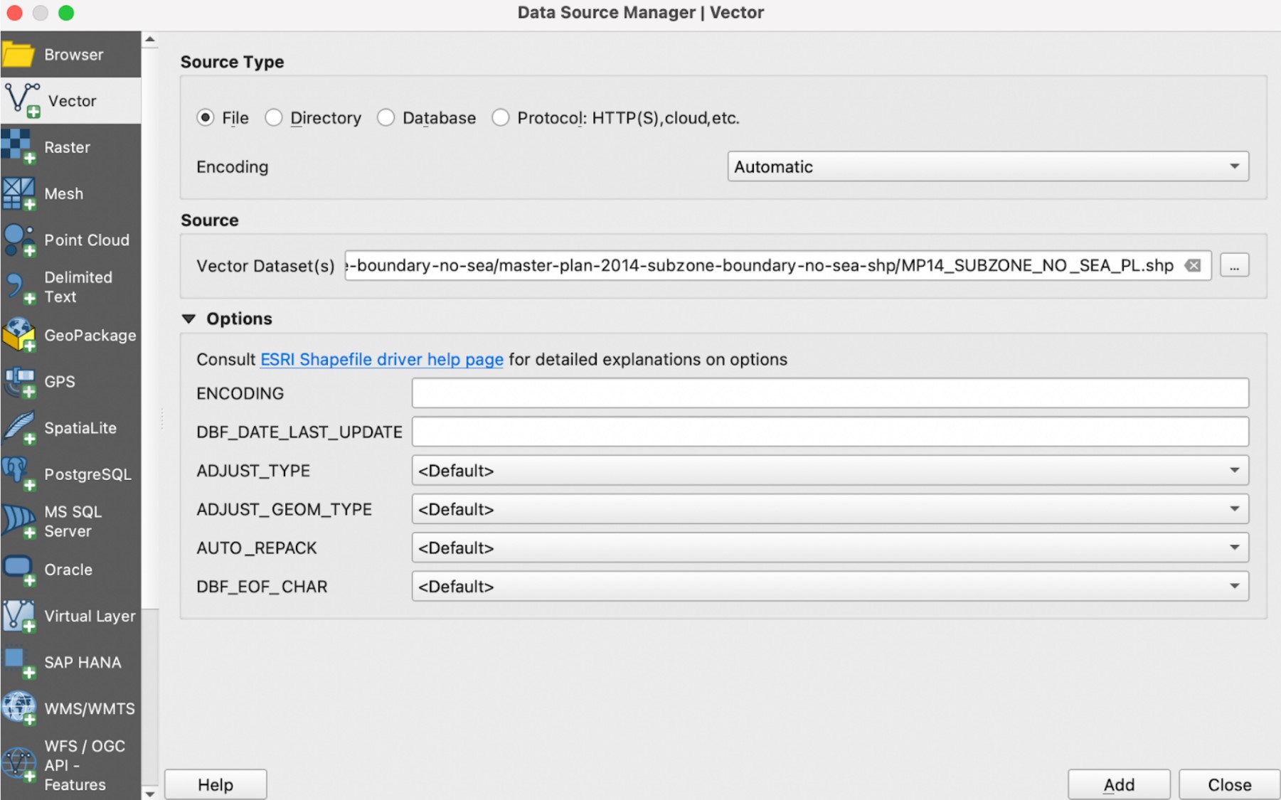 The Data Source Manager dialog window appears. For Vector Dataset(s), select MP14_SUBZONE_NO_SEA_PL.shp.