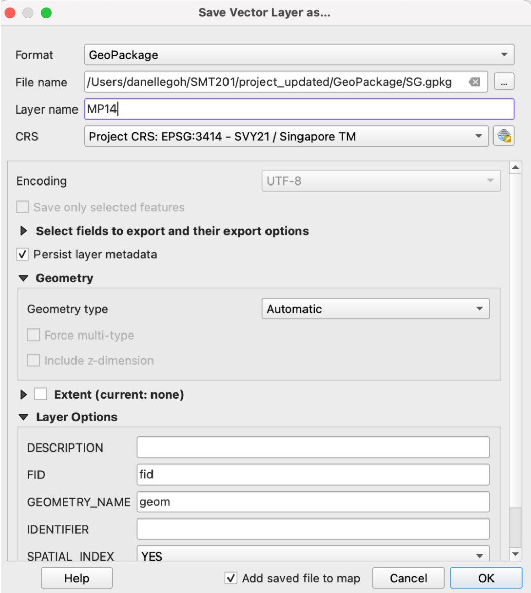 The Save Vector Layer as dialog window appears. For Format, select GeoPackage. For File name, select the SG GeoPackage you previously created. For Layer name, enter MP14. For CRS, select Project CRS: EPSG:3414 - SVY21. Your dialog window should look like the screenshot below.