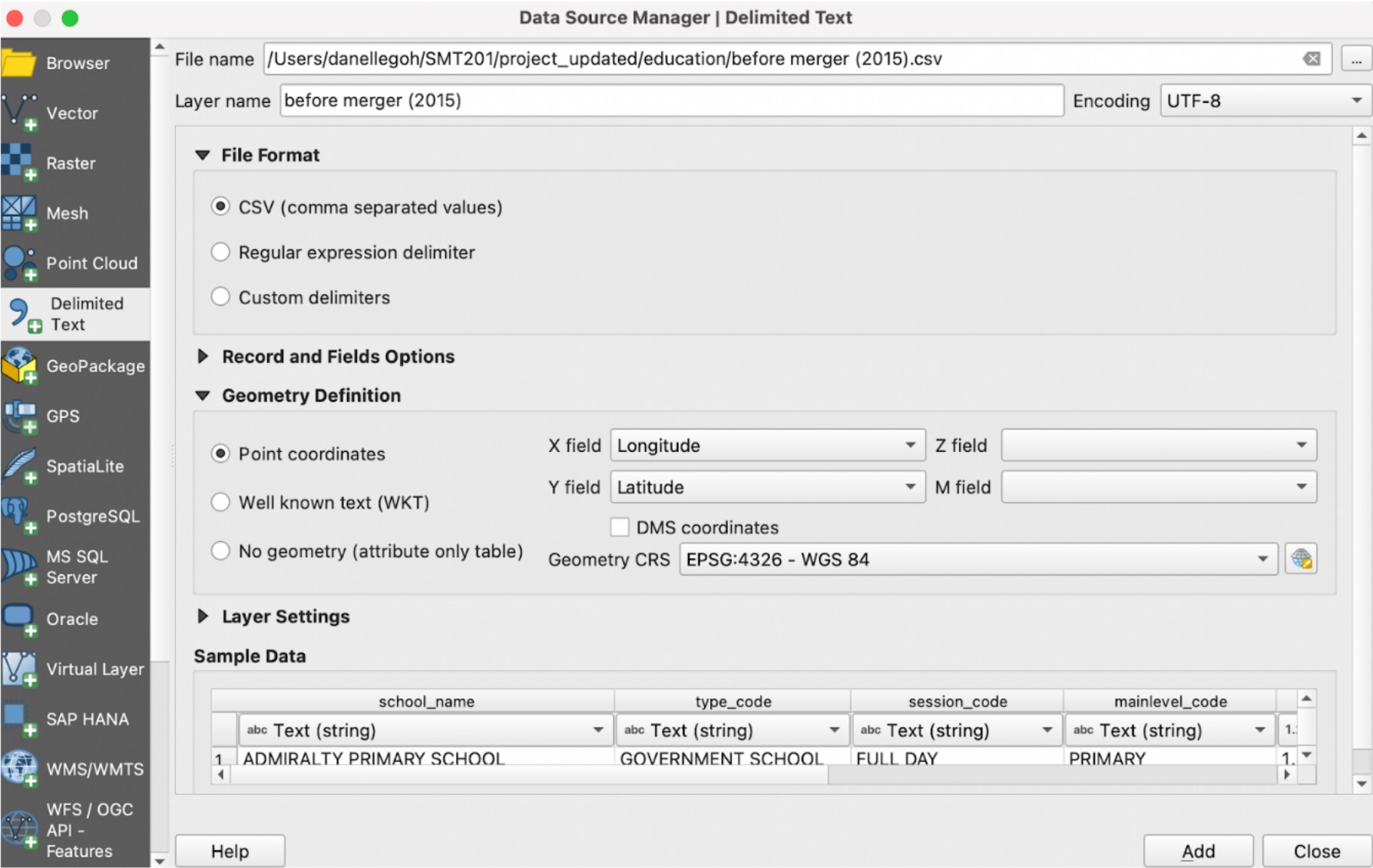 Import the csv files for education into QGIS. You can start with the file for before the 2015 merger. Select Layer > Add Layer > Add delimited text layer. The Data Source Manager dialog window appears. Open the before merger (2015) CSV file. For Layer name, enter before merger (2015). Under Geometry Definition, select Point coordinates. For X field, select Longitude, and for Y field, select Latitude. For CRS, select EPSG:4326 - WGS 84. Your dialog window should look like the screenshot below.