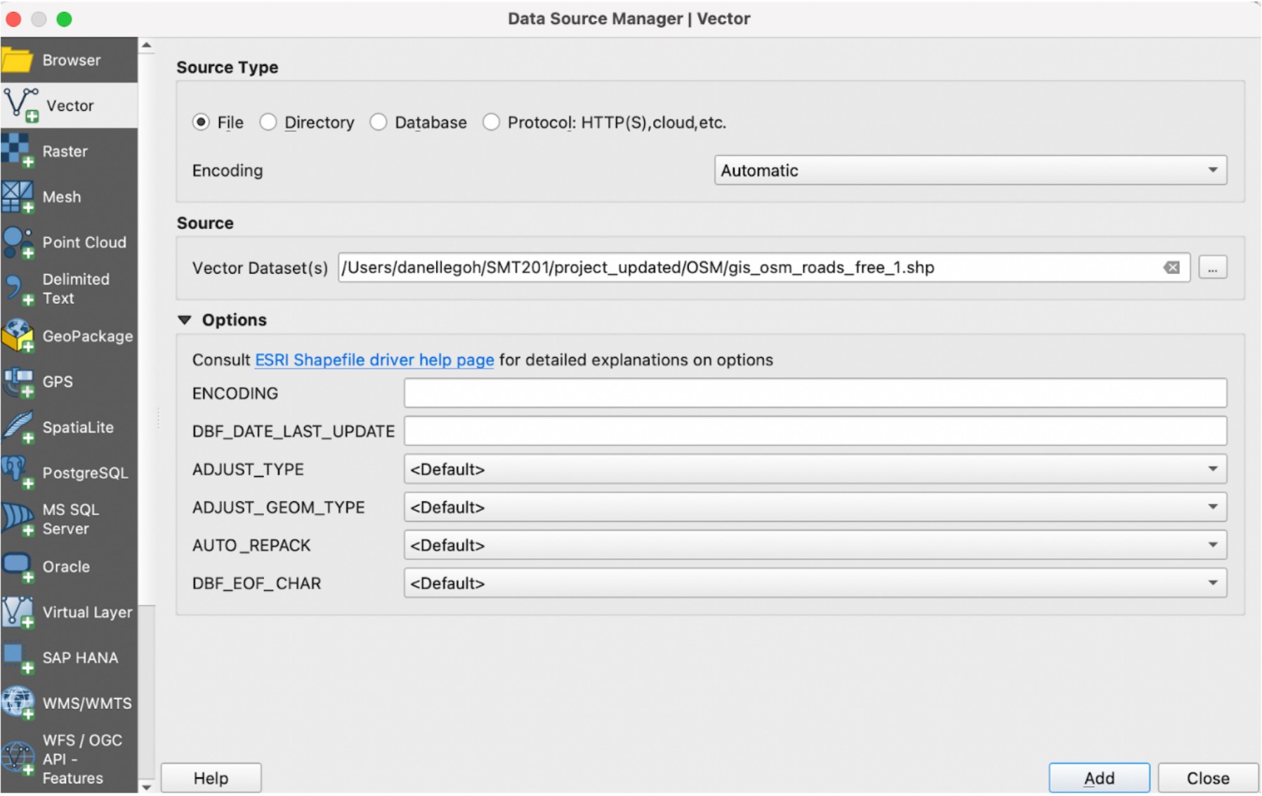 Firstly, we will need to import the roads layer from the OpenStreetMap dataset. Select Layer > Add Layer > Add Vector Layer. The Data Source Manager dialog window appears. Open the gis_osm_roads_free_1.shp file.