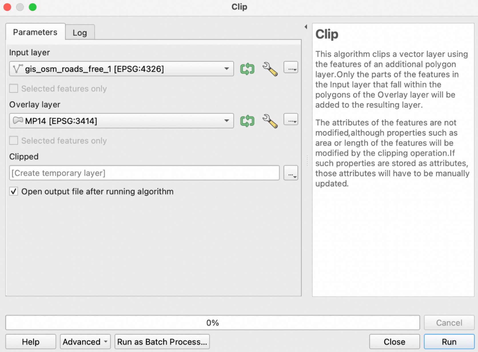 The Clip dialog window appears. For Input layer, select gis_osm_roads_free_1.shp. For Overlay, select MP14. Click on Advanced Options icon. For Invalid feature filtering, select Do not Filter (Better Performance). Your Clip dialog window should look like the screenshot below. When ready, click Run.