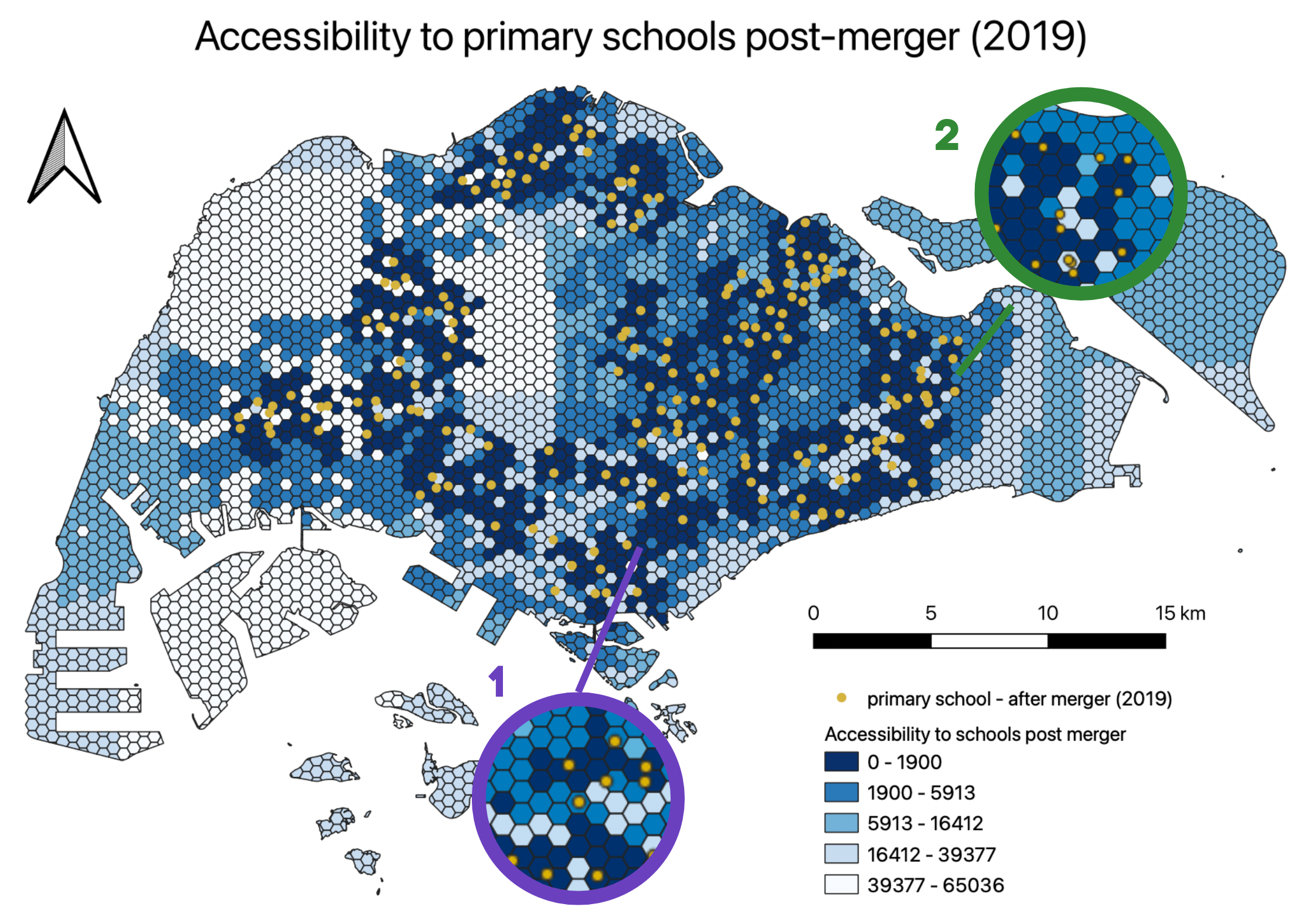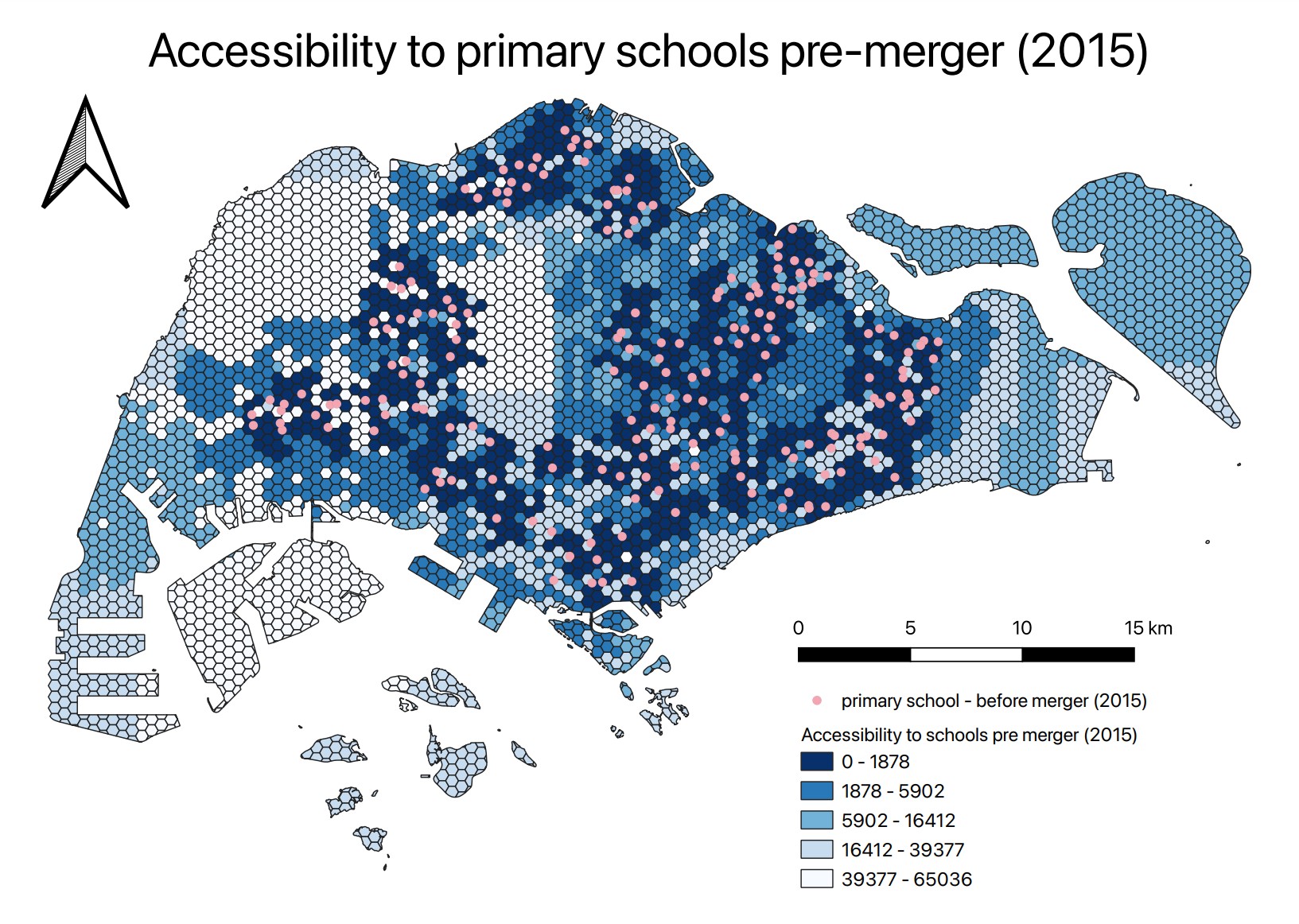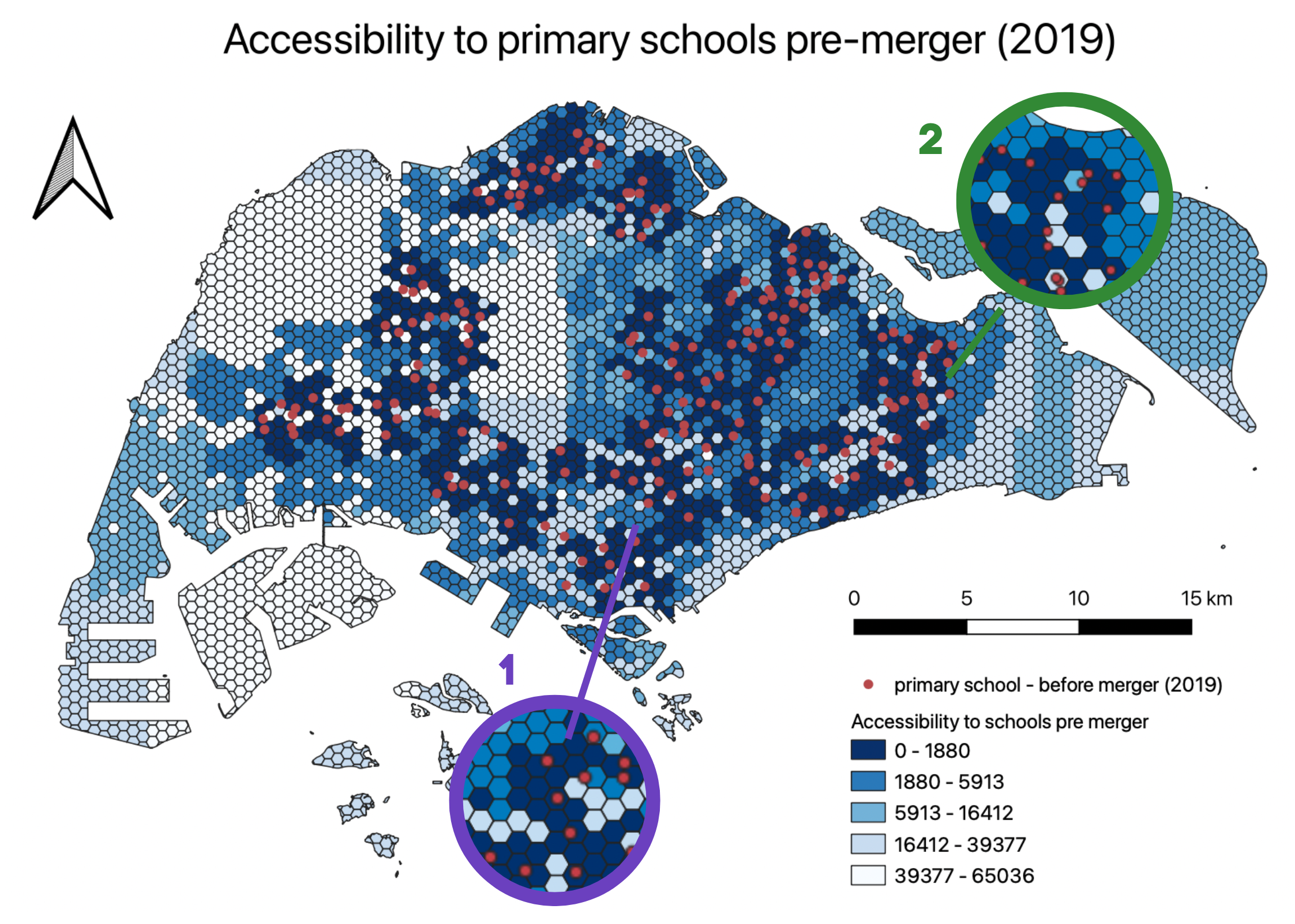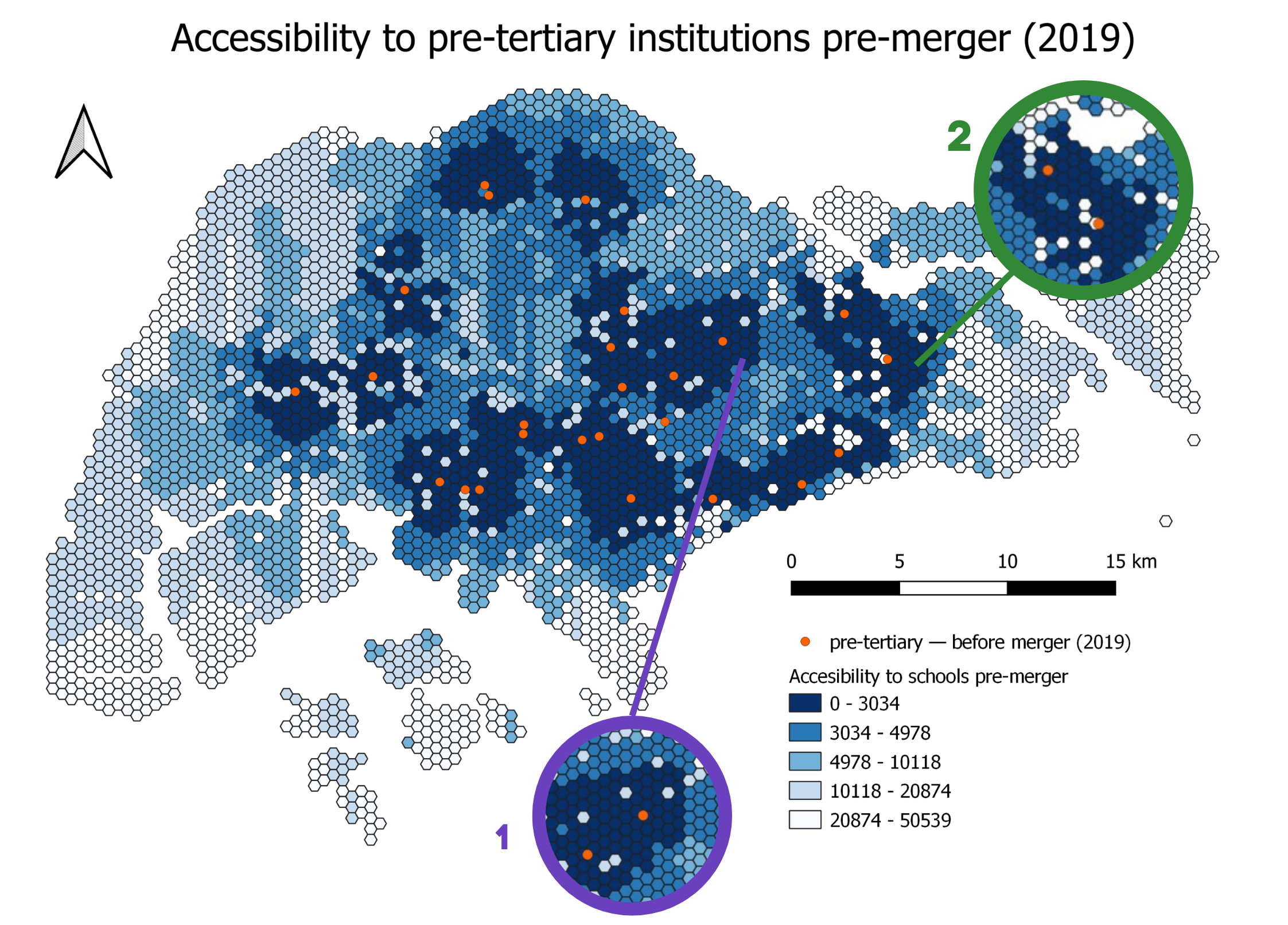 Overall, although the accessibility to primary schools decreased, the equity of access to primary schools was not greatly affected, due to the government choosing to merge schools that were already in close proximity. Additionally, there are a large number of primary schools, so each merger would not have as significant an impact on accessibility as compared to pre-tertiary institutions.