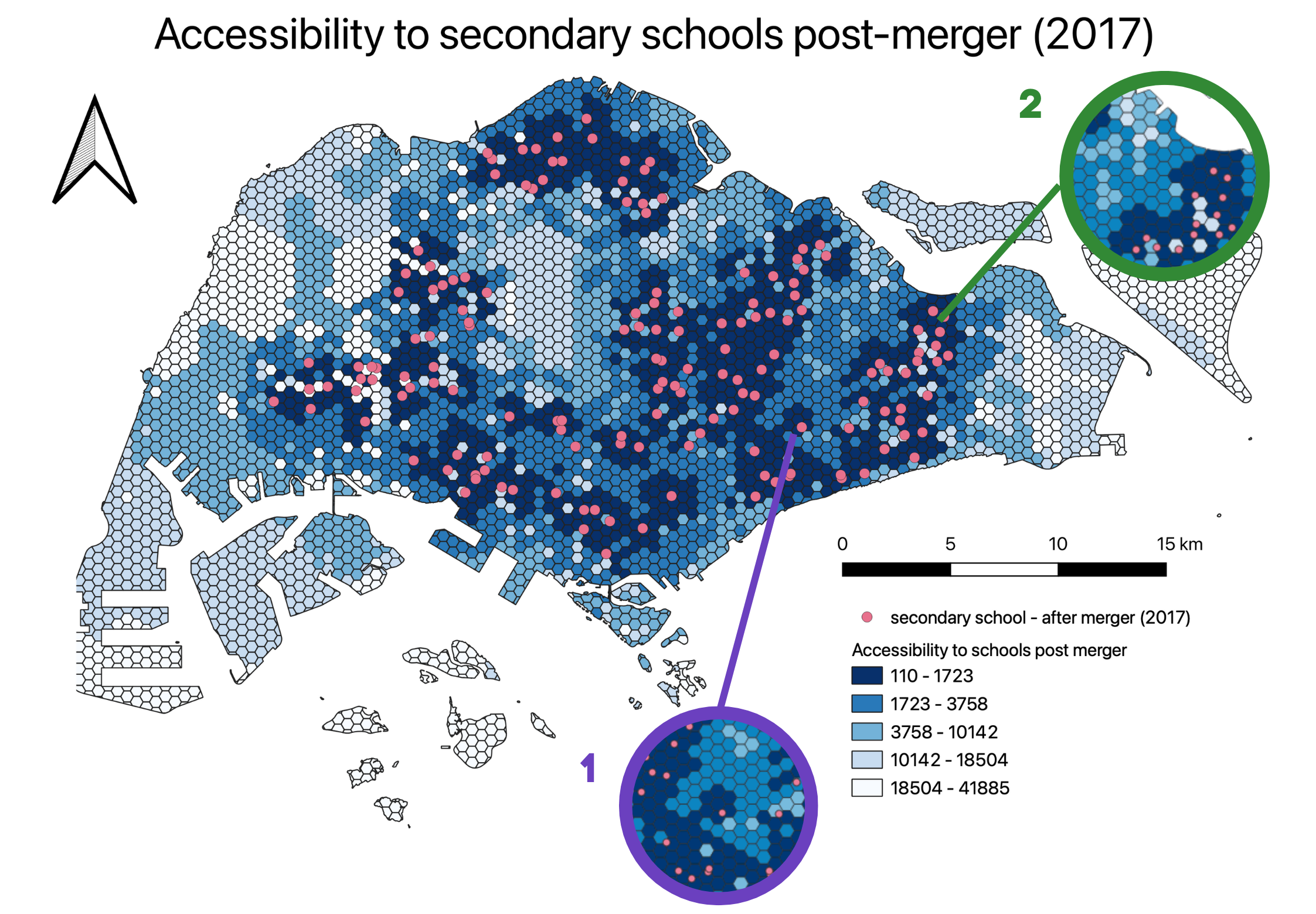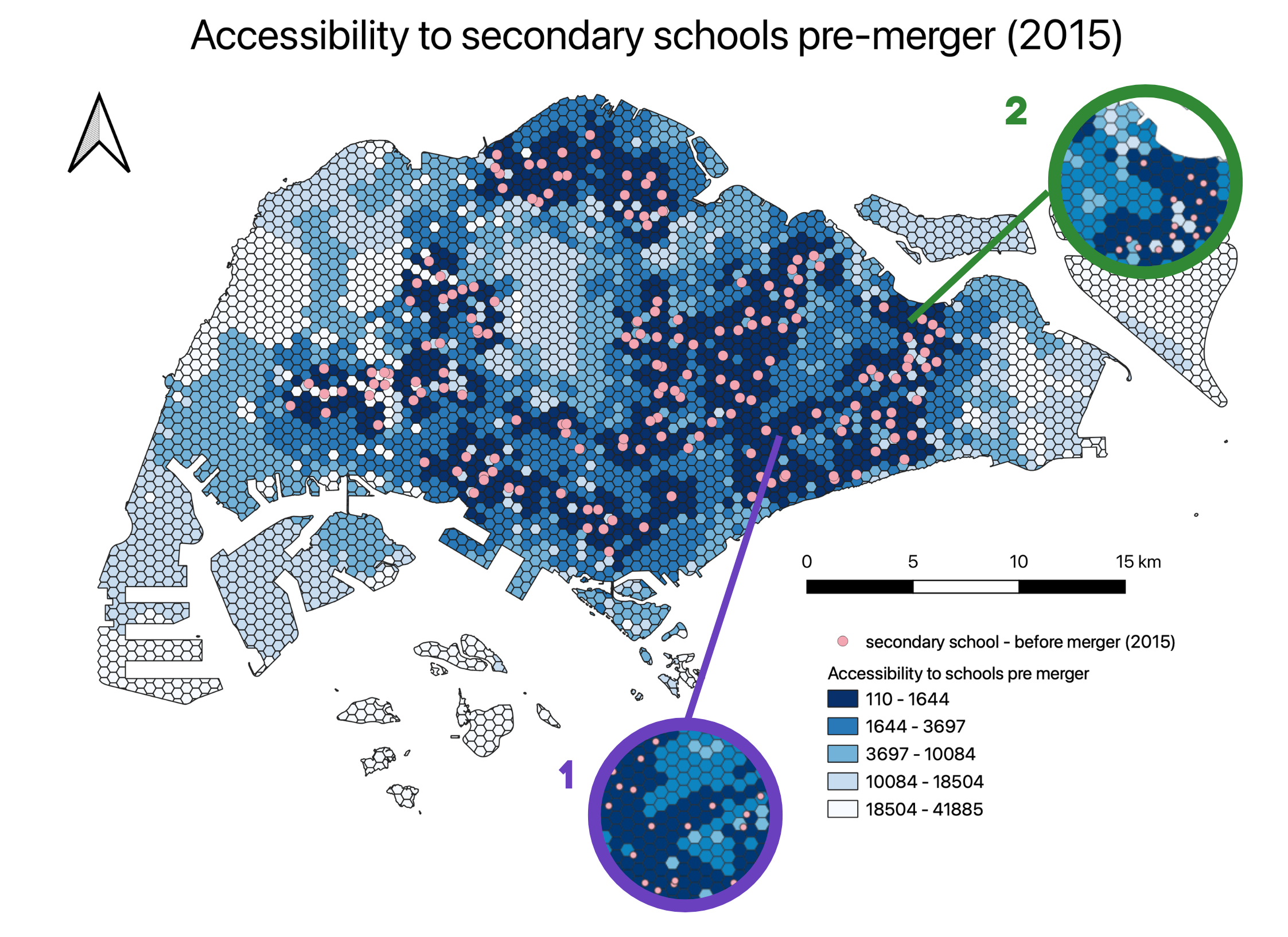 In the highlighted Area 2, the merger of Siglap Secondary School at Pasir Ris has decreased accessibility to secondary schools for those living in the area. As seen in the diagram, the presence of Siglap Secondary School made it accessible for more residents as the area of high accessibility is larger. However, after the merger, the residents in this area. The shortest distance to the nearest school of the area where Siglap Secondary School is located increased from 110m to 2522m.