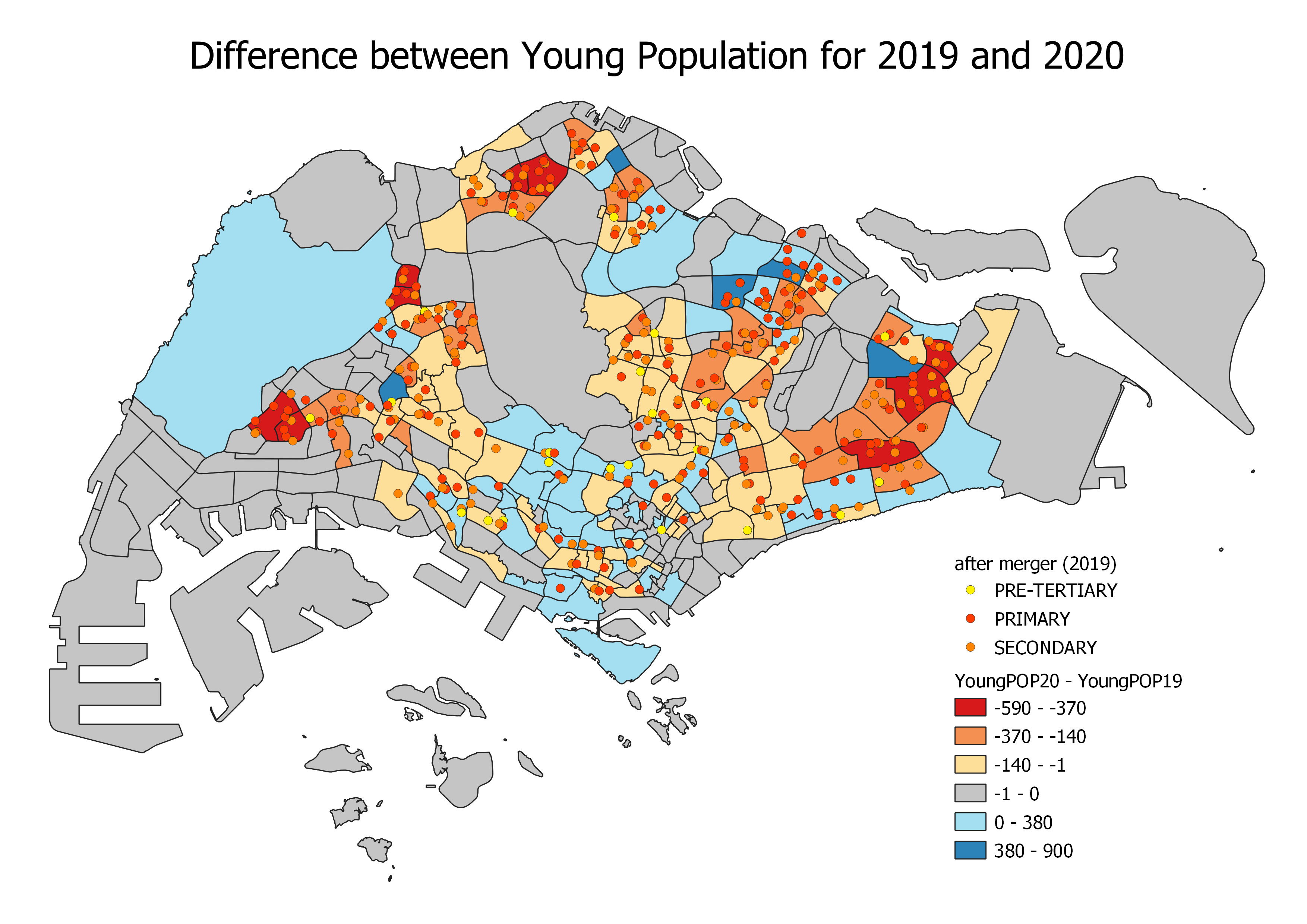 As it was difficult to visualise the changes in population by looking at the chloropleth maps, our team plotted new maps to visualise the difference in population for each pair of consecutive years. We classified the values such that shades of red reflect an increase in population (e.g POP19 > POP20) while shades of blue reflect a decrease (e.g POP19 < POP20). Grey indicates that there was no change in population during the two years.