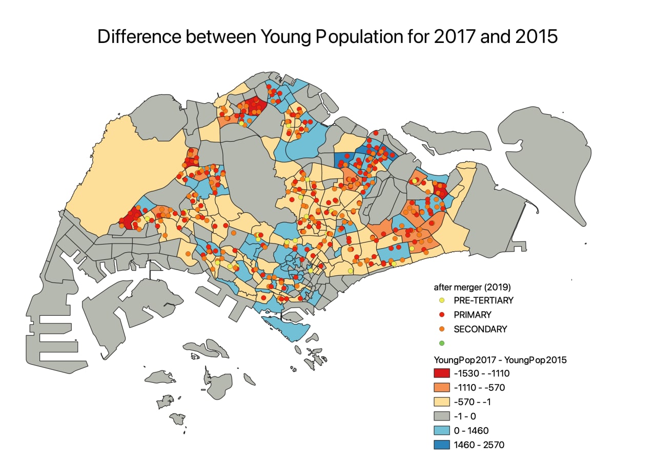 Fernvale, Punggol and Waterway East have a decrease in young people living in the area. However, these areas do not have that many schools densely populated in the area as compared to the areas with an increase in young people. Hence, these areas may not be that accessible to the schools and resulted in a decrease in young people living there.